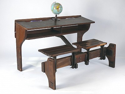 Beschreibung: SIE HABEN HIER DIE GELEGENHEIT EIN SELTENES STÜCK ZEITGESCHICHTE DER JAHRE UM 1920 ZU ERWERBEN. EINE ALTE SCHULBANK GENAUER GESAGT BANK NR. 2 AUS EINER REIHENSCHULBANK.