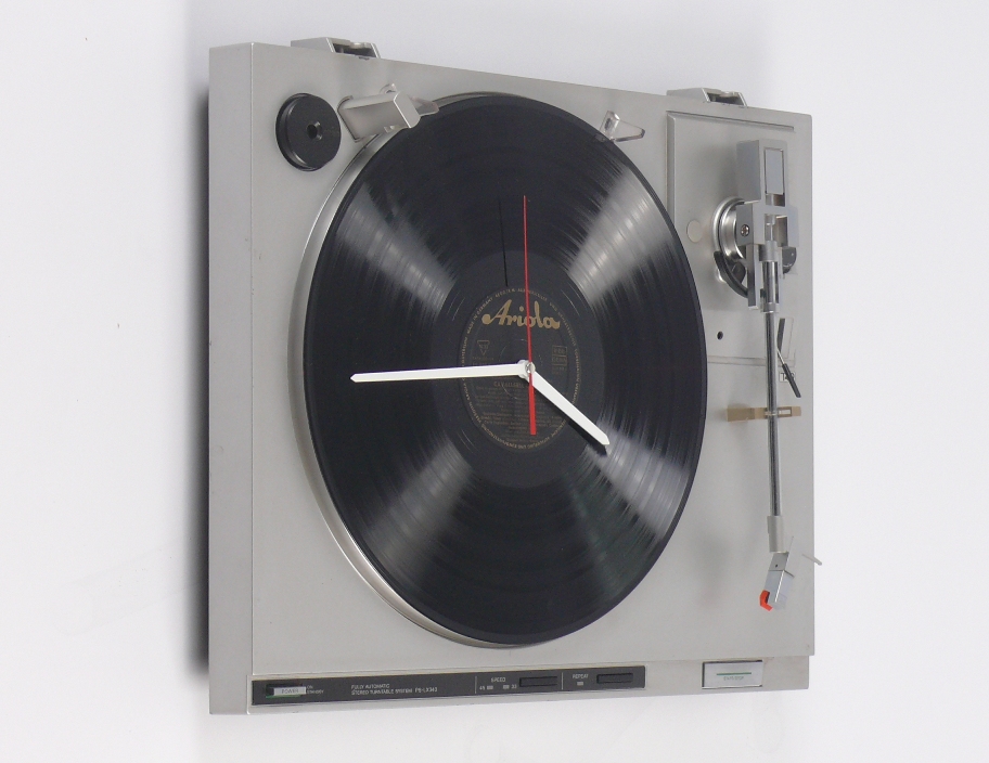 Beschreibung: DIE ETWAS ANDERE UHR FÜR FREUNDE DES VINYLS. DIE BASIS EIN AUSGEDIENTER SONY PLATTENSPIELER.ALS ZIFFERBLATT DIENT EINE ALTE ARIOLA LP AUS SCHWARZEM VINYL. IM PLATTENSPIELER WURDE DAS QUARZ UHRWERK VERBAUT.