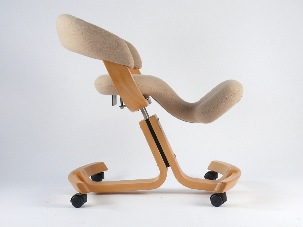 Der Kniestuhl gehört zu der Balans –Gruppe.Zu dieser Gruppe zählen auch Designentwürfe von Peter Opsvik der für Stokke Sitzmöbel entwarf.Den Kniestuhl in dieser Form gab es in verschiedenen