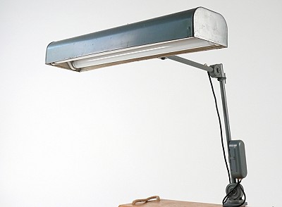 Beschreibung: XL – ARBEITSLAMPE AUS GRAU LACKIERTEM STAHL PRODUZIERT UM 1950