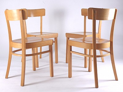 VIER STÜHLE MODELL „ FRANKFURTER KÜCHE „ GEFERTIGT SIND DIESE STÜHLE AUS BUCHENHOLZ.DIE BAUWEISE IST SEHR STABIL DA DIE HINTEREN BEINE DOPPELT VERSCHRAUBT WURDEN.PRODUZIERT WURDEN DIES 4 EXEMPLARE IN DER GEGENWART ALSO RETROWARE IM STIL DER ALTEN ZEIT.DIE ORIGINALE WURDEN ERSTMALS IN DER FRANKFURTER KÜCHE GEZEIGT DAMALS AUF EINER MESSEAUSSTELLUNG.VON DA AN HATE DER STUHLTYP DIESEN BEINAMEN.